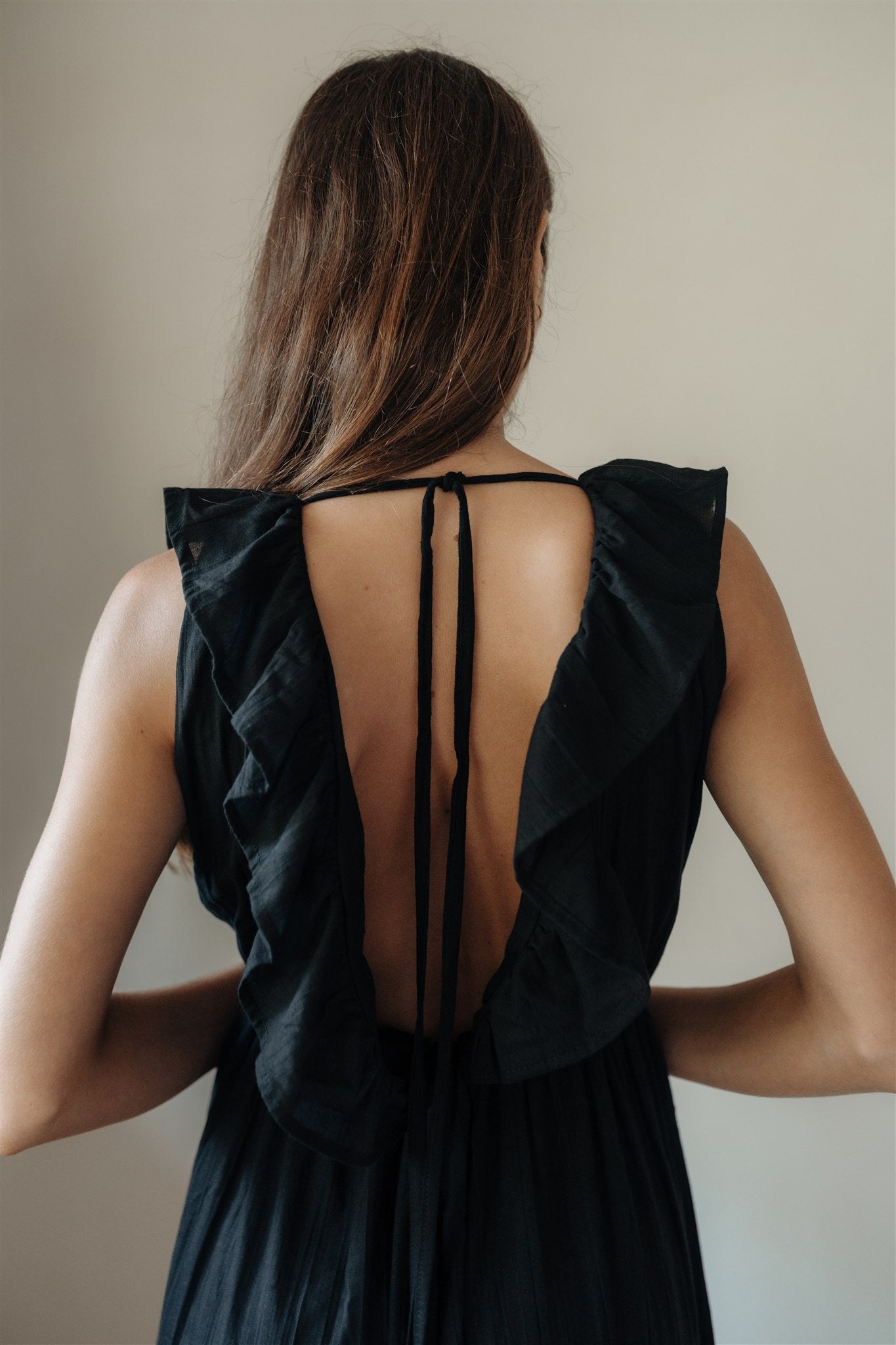 Feminine, sophisticated, fun and flirty is what best describes our best-selling dress from our latest collection. The ruffles adorn the top and at the bottom; comes with elasticized waistline and it is floor length . This ultra-chic dress can be worn from day to night, just accessorize accordingly. Plunging V neckline front and back.