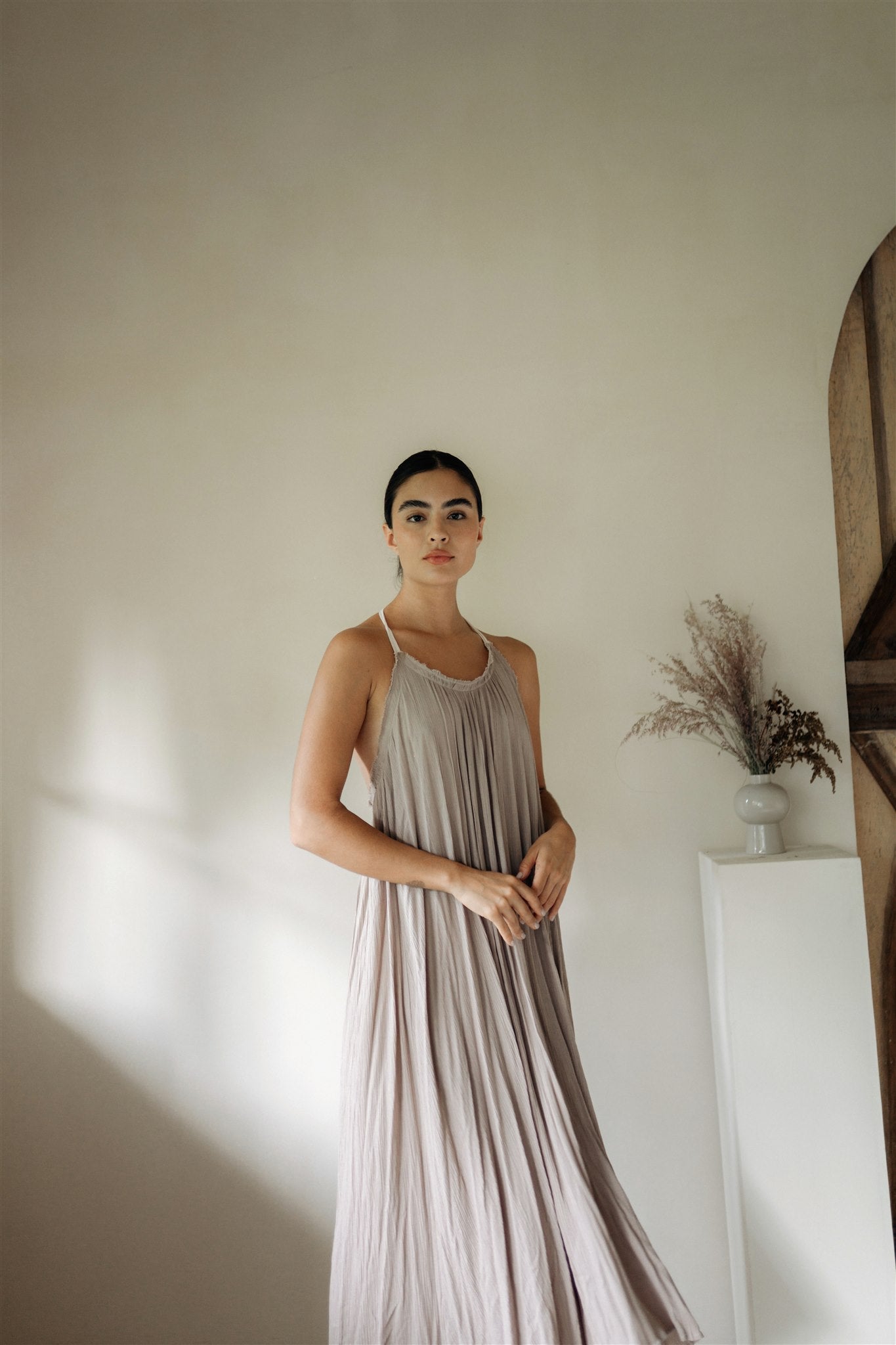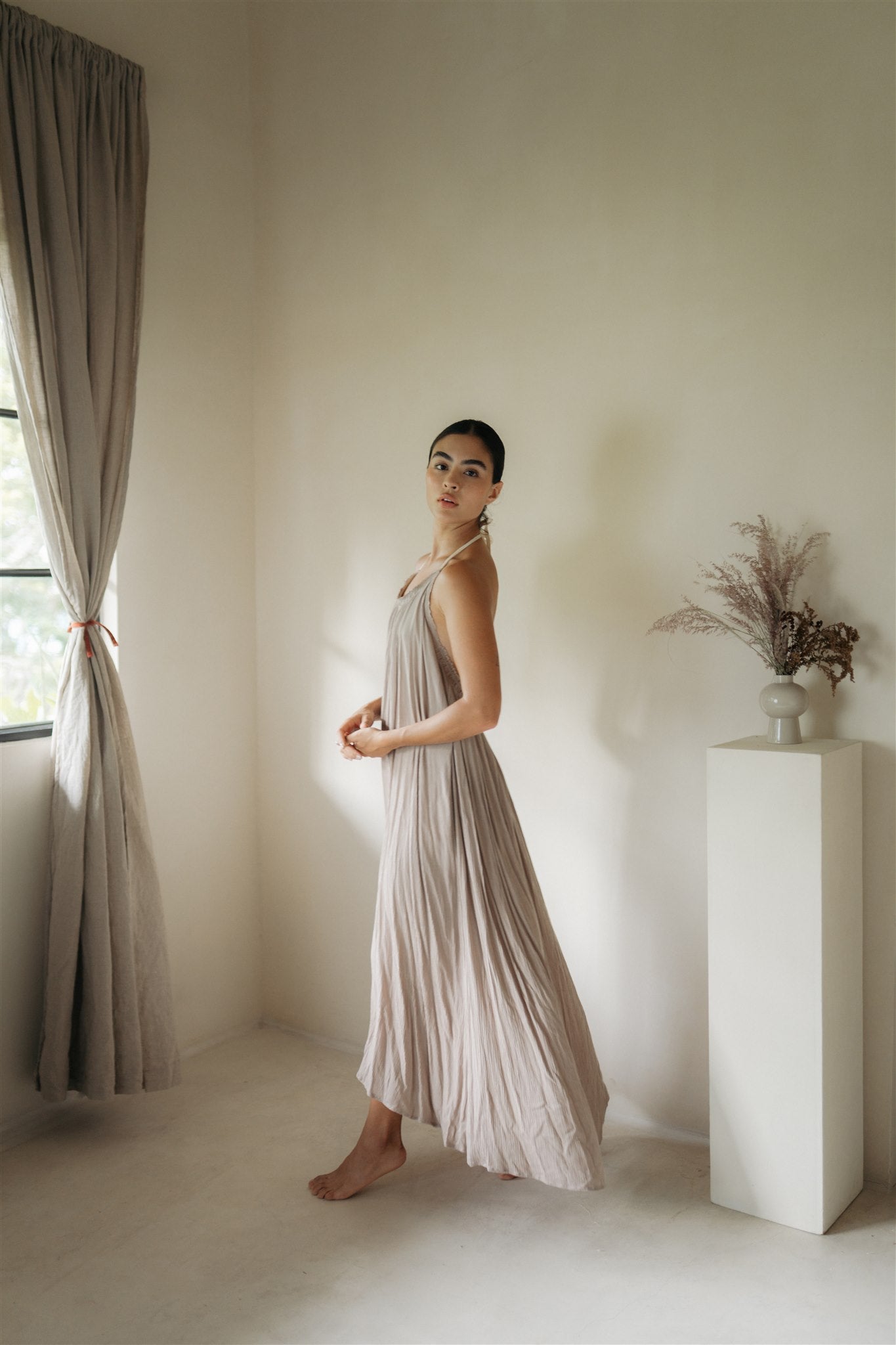 • Simple yet sexy low back halter dress, that ties behind the neck with adjustable cotton straps. Vaporous fabric that moves as you walk with a very feminine flow.